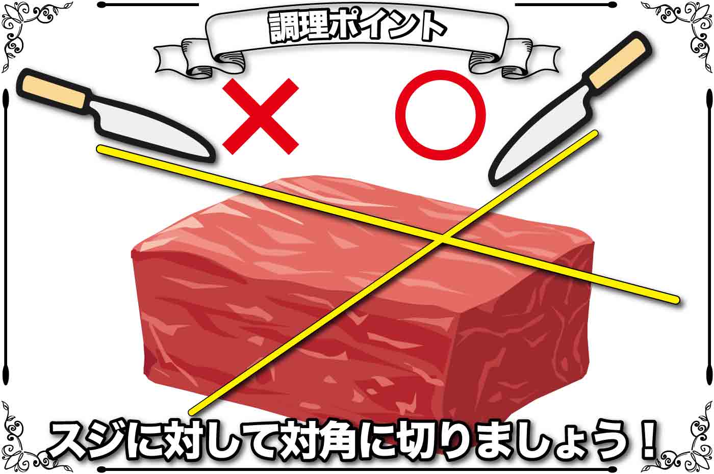 お肉を切るときは、筋繊維(赤いすじ)に対し対角(90度)に切りましょう。食べるときのお肉の柔らさが全然ちがってきます。