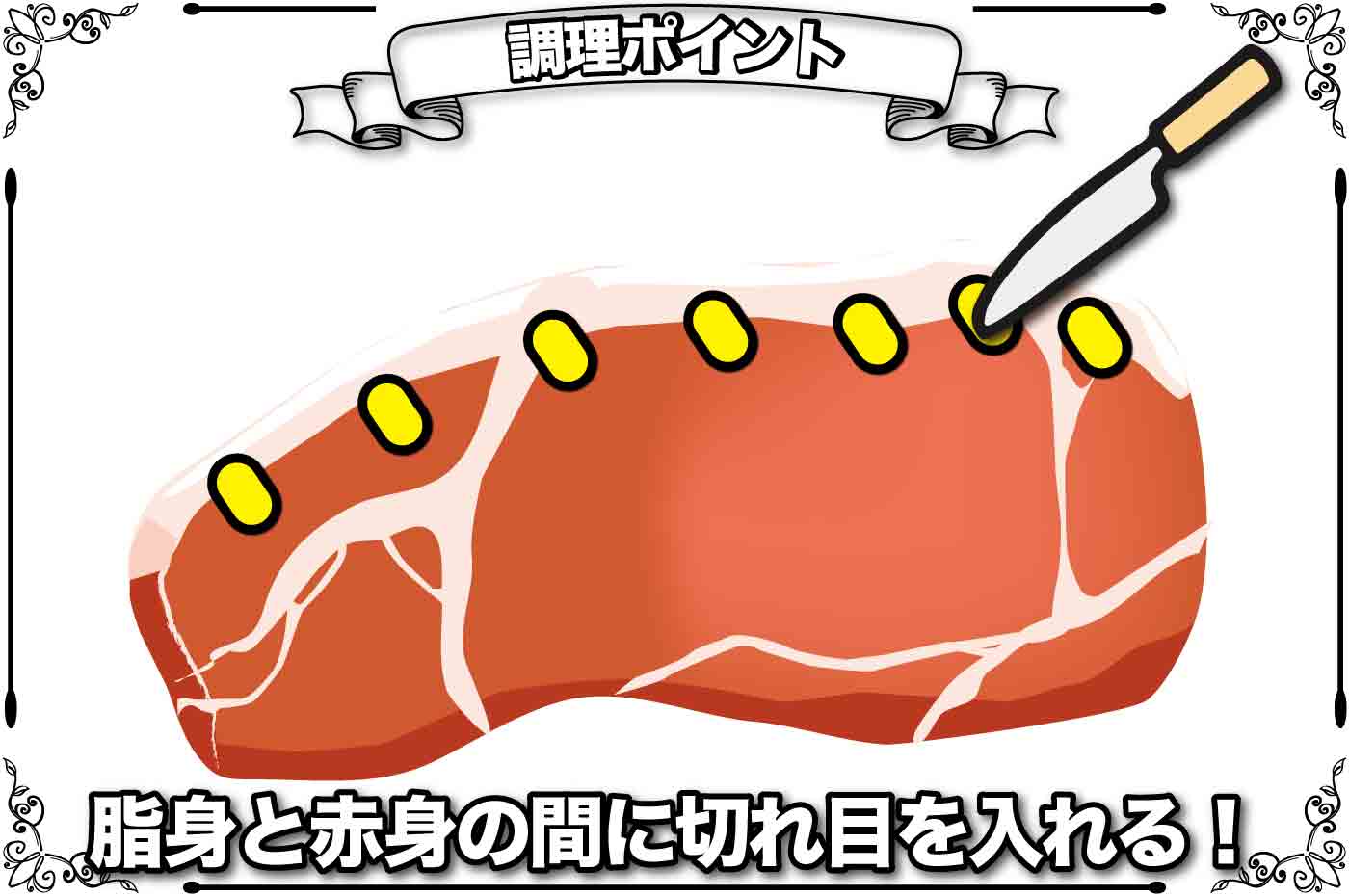 脂身と赤身の間にある層に、包丁の先を使い軽く切れ目を入れましょう。お肉の歯ごたえが柔らかくなります。